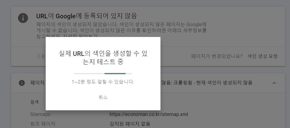 7. 실제 URL의 색인을 생성할 수 있는지 테스트 중(1~2분 정도 걸릴 수 있습니다.) (팝업창) (아래 사진)