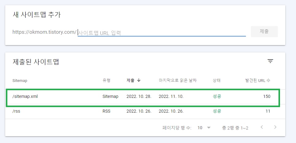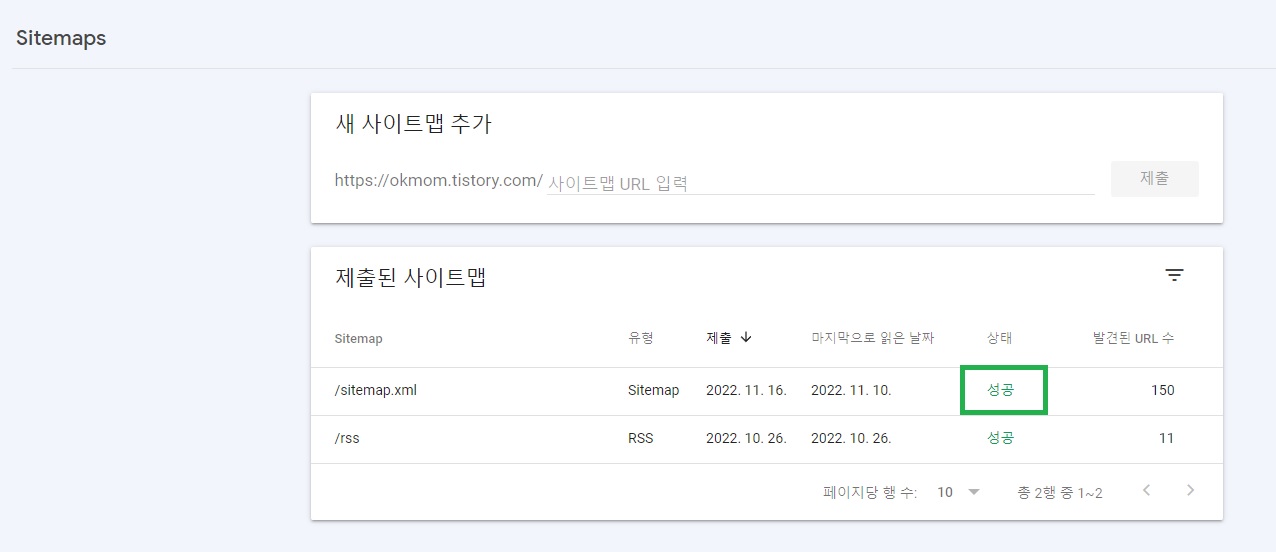 9) 제출된 사이트맵 상태가 '성공'이면 끝. 만일 "가져올수 없음"이라고 뜬다면 새로고침 반복.