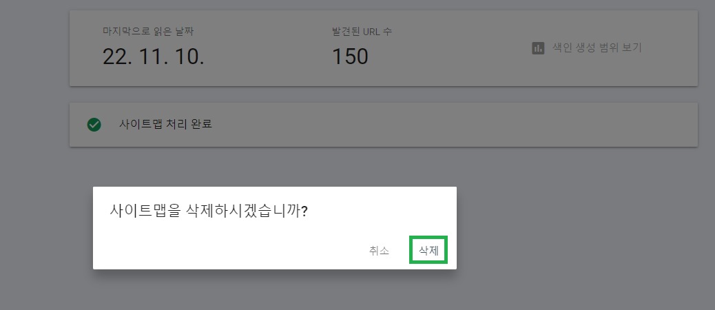 7) "사이트맵을 삭제하시겠습니까?" 창에서 삭제 클릭! (아래 사진)