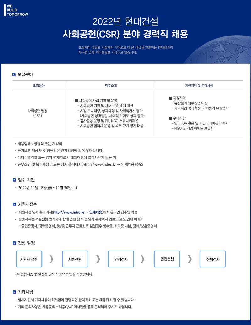 현대건설 2022년 사회공헌(CSR) 분야 경력직 채용