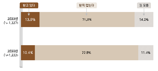 일요일에 쉴 경우 무급인 경우가 대부분이다. 주휴수당을 받는지 물었더니 ‘받고 있다’는 응답이 13.3%로 나타났다. 2020년보다 3.5%포인트 상승했지만 여전히 낮은 수준이다.