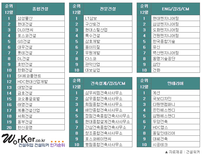 취업인기 1위 난공불락 건설사 어디? 12월 순위 파고파고