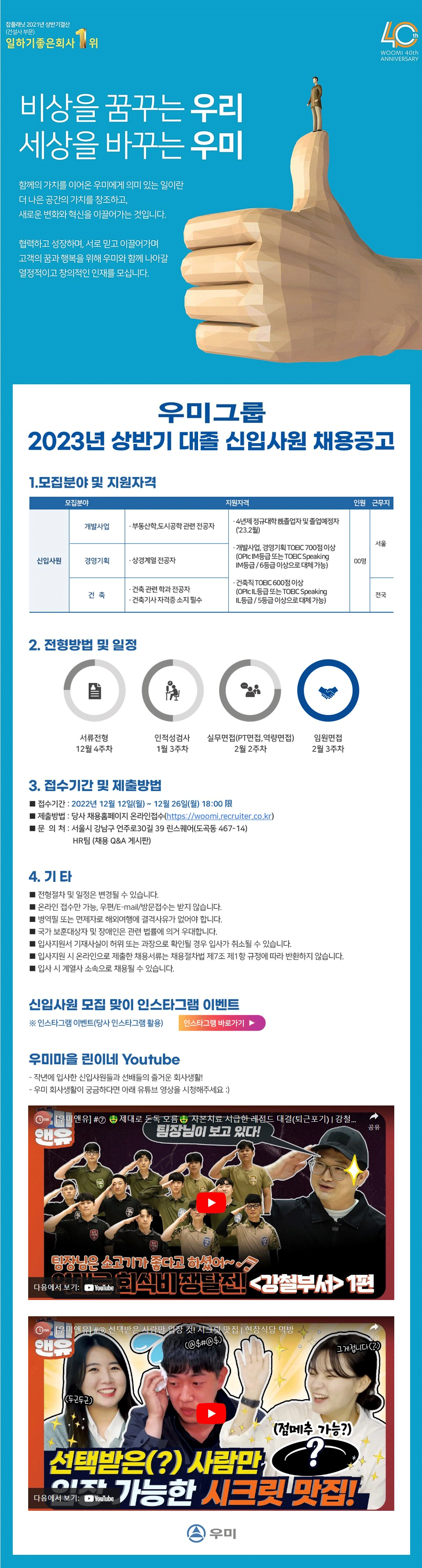 우미건설의 우미그룹이 2023년 상반기 대졸 신입사원 채용을 진행한다. 모집분야는 개발사업, 경영기획, 건축 등이며 26일까지 회사 채용홈페이지에서 온라인 지원하면 된다.