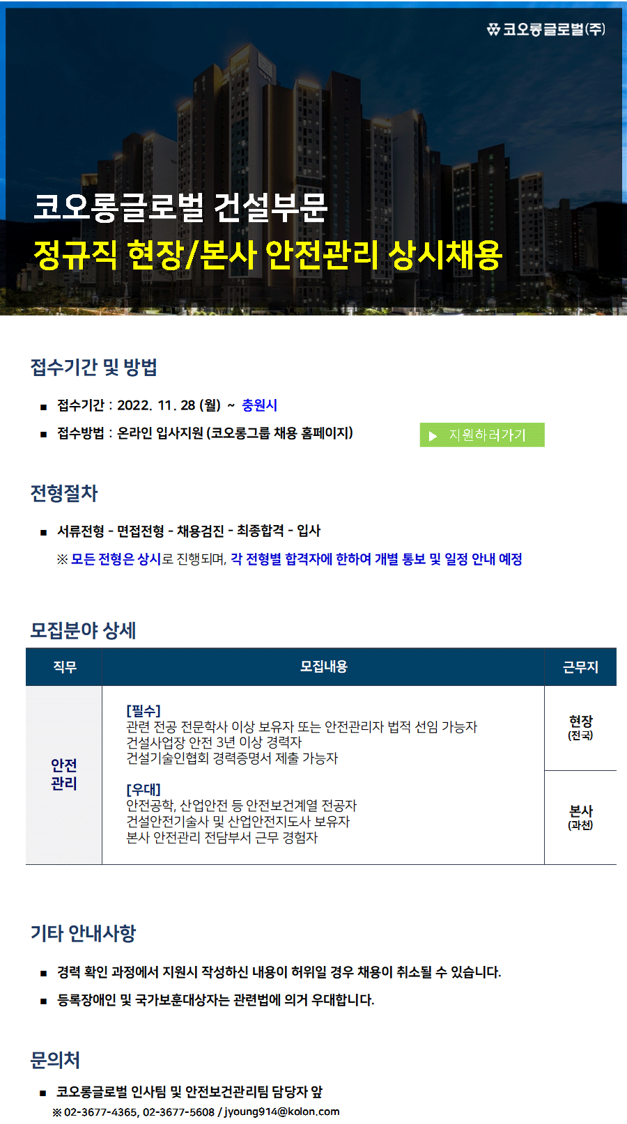 코오롱글로벌이 안전관리 상시채용을 진행 중이다.
