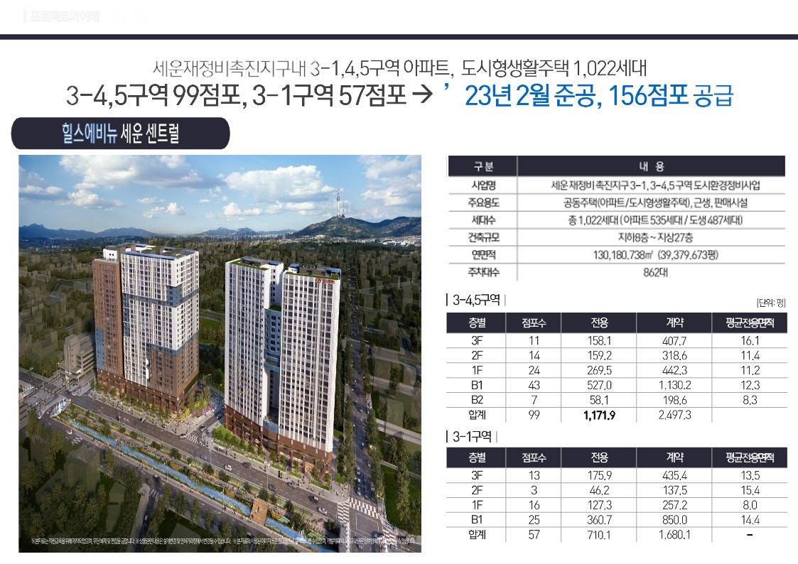 3구역 중 3-1,3-4-5 구역은 현대 힐스 에비뉴 센트럴(23년 3월부터 입주)로 지하8층 ~ 지상27층으로 130,180,738㎡ (39,379,673평) 대지는 2,772평 규모이다