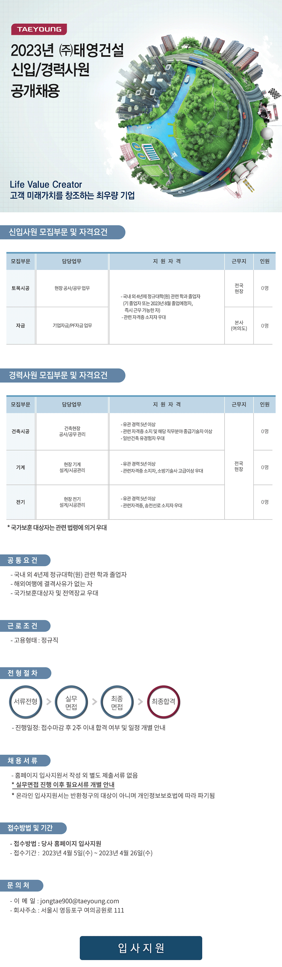 입사희망자는 4월 26일까지 태영건설 홈페이지에서 온라인 입사지원하면 된다.