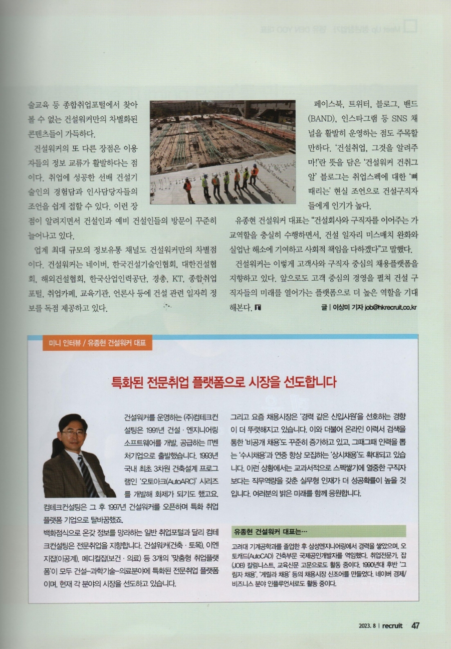 [월간리크루트 2308] Leading Company 건설 구인구직 플랫폼 ‘건설워커’