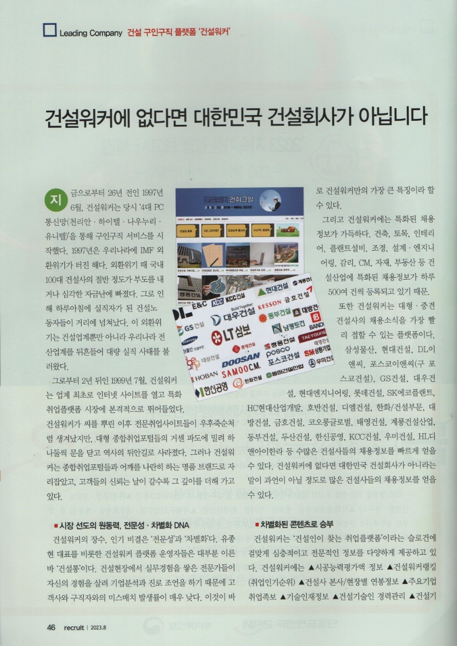 [월간리크루트 2308] Leading Company 건설 구인구직 플랫폼 ‘건설워커’