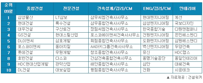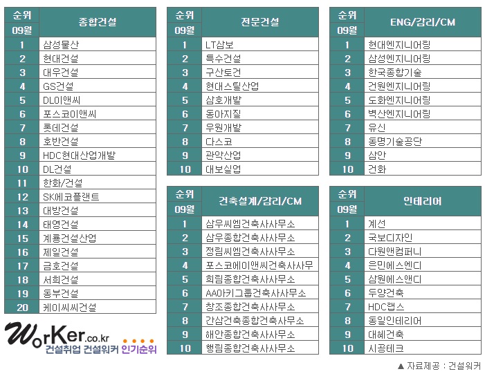 건설워커 September Ranking, 건설회사 취업인기순위