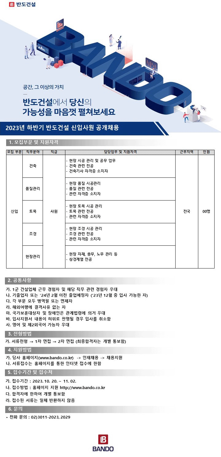 - 반도건설, 2023년 하반기 신입사원 공개채용 원문 주소(url)