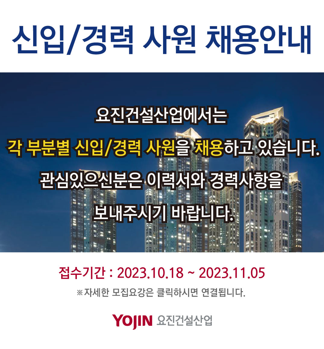 [요진건설산업(주)] 2023년 하반기 신입/경력사원 채용 (마감일 : 11/05) - 건설취업 건설워커
