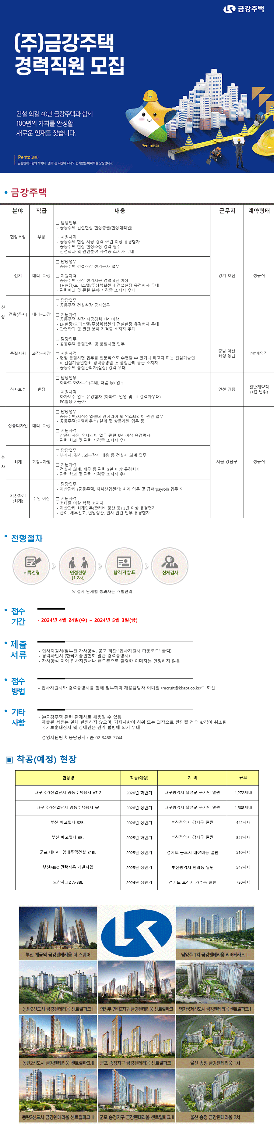 입사지원서는 건설워커에서 내려받아 작성한 뒤 5월 3일까지 경력증명서와 함께 첨부하여 채용담당자 이메일(recruit@kkapt.co.kr)로 제출하면 된다.