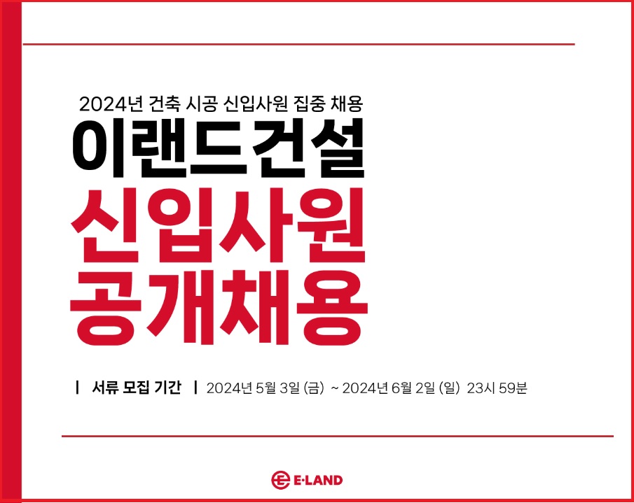 이랜드건설 2024년 건축시공 신입사원 집중 채용 이랜드건설 신입사원 공개채용 서류 모집 기간 : 2024년 5...