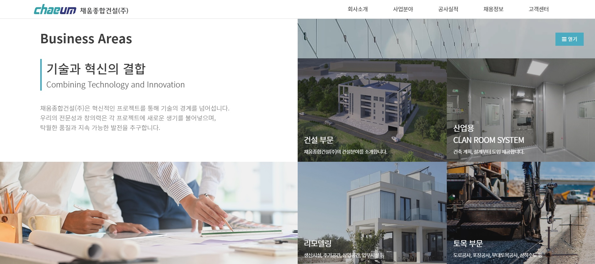 채움종합건설(주)는 설립한 이래 꾸준히 괄목할만 매출 신장을 기록하고 있으며, 일반적인 건축공사업을 비롯하여 특히 크린룸건축공사업과 공조설비공사업등 반도제공장의 신축, 증축.개조등 에 관한 특별한 기술력으로 성장을 지속중에 있습니다.