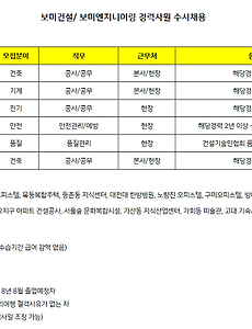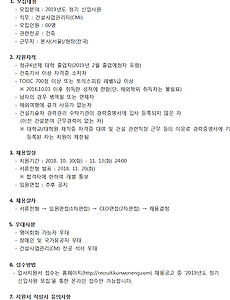 쌍용건설 경력직원 공개채용(건축/기전 부문) 회사명 쌍용건설(주) 대표자 김석준 설립일 1977년10월18일 사업자등록번호 120-81-01957 회사규모 대기업(1000명~) 근로자수 1,200명 자본금 182,662,000,000원 주요사업 토목,건축,플랜트 홈페이지 http://www.ssyenc.com [건설워커 2018-10-18] 쌍용건설이 경력직원 공개채용을 진행한다. 모집분야는 국내건축(시공, 공무, 견적), 설비(시공, 견적), 전기(시공, 견적) 등이며 28일까지 회사 홈페이지에서 입사지원하면 된다. 공통사항은 4년제 대학교 이상 해당분야 전공자, 영어회화 능통자 우대, 관련 자격증 소지자 우대, 해외근무 가능자 우대, 보훈대상자 및 장애인은 관련법률에 의해 우대함 등이다. 자세한 정보..
