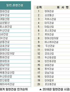 이 순위는 2010년 8월 1일 부터 2011년 7월 말까지 국내건설공사 수주에 적용됩니다. 순위 회 사 명 토건 시평액 전년도 순위 지역 1 현대건설 10조 2,209억 1 서울 2 삼성물산 9조 6,415억 2 서울 3 지에스건설 8조 2,757억 4 서울 4 대우건설 7조 8,203억 3 서울 5 대림산업 7조 597억 5 서울 6 포스코건설 6조 7,171억 6 경북 7 롯데건설 5조 2,380억 8 서울 8 현대산업개발 3조 9,227억 7 서울 9 에스케이건설 3조 3,091억 10 서울 10 두산건설 3조 3,380억 11 서울 11 한화건설 2조 3,598억 13 경기 12 금호산업 2조 893억 12 전남 13 두산중공업 2조 778억 15 경남 14 한진중공업 2조 192억 14 부산 ..