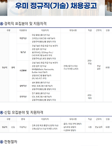 대상건설 취업족보 "웰라움(WELLAUM" 대상건설 취업정보 업뎃 "웰라움(WELLAUM) 잡(JOB)으세요""Wellaum 잡으세요" 대상건설은 국토교통부가 발표한 2023년 토목건축공사업 시공능력평가액 3,...blog.naver.com 대상건설 경력사원 채용 건축(품질,공사,공무), 기계·전기, 안전 https://blog.naver.com/autoarc/223462138666 대상건설 경력사원 채용 건축(품질,공사,공무), 기계·전기, 안전모집분야 및 자격요건 접수기간 및 접수방법 접수기간 : 2024년 5월 29일(수) ~ 2024년 6월 11일(화) 접...blog.naver.com구 분모집분야모집인원직급근무지자격요건경 력(정규직)건축(품질,공사,공무)0명사원~차장현장(전국)- 현장 실..